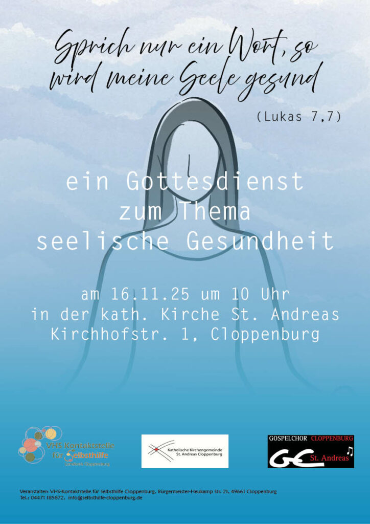 Gemeinsam mit dem Arbeitskreis Seelische Gesundheit der VHS Kontaktstelle für Selbsthilfe im Landkreis Cloppenburg findet am Sonntag, den 16. November 2025 um 10 Uhr unter dem Motto „Sprich nur ein Wort, so wird meine Seele gesund“ ein besonderer Gottesdienst in der katholischen Kirche St. Andreas, Kirchhofstr. 1 in Cloppenburg statt.